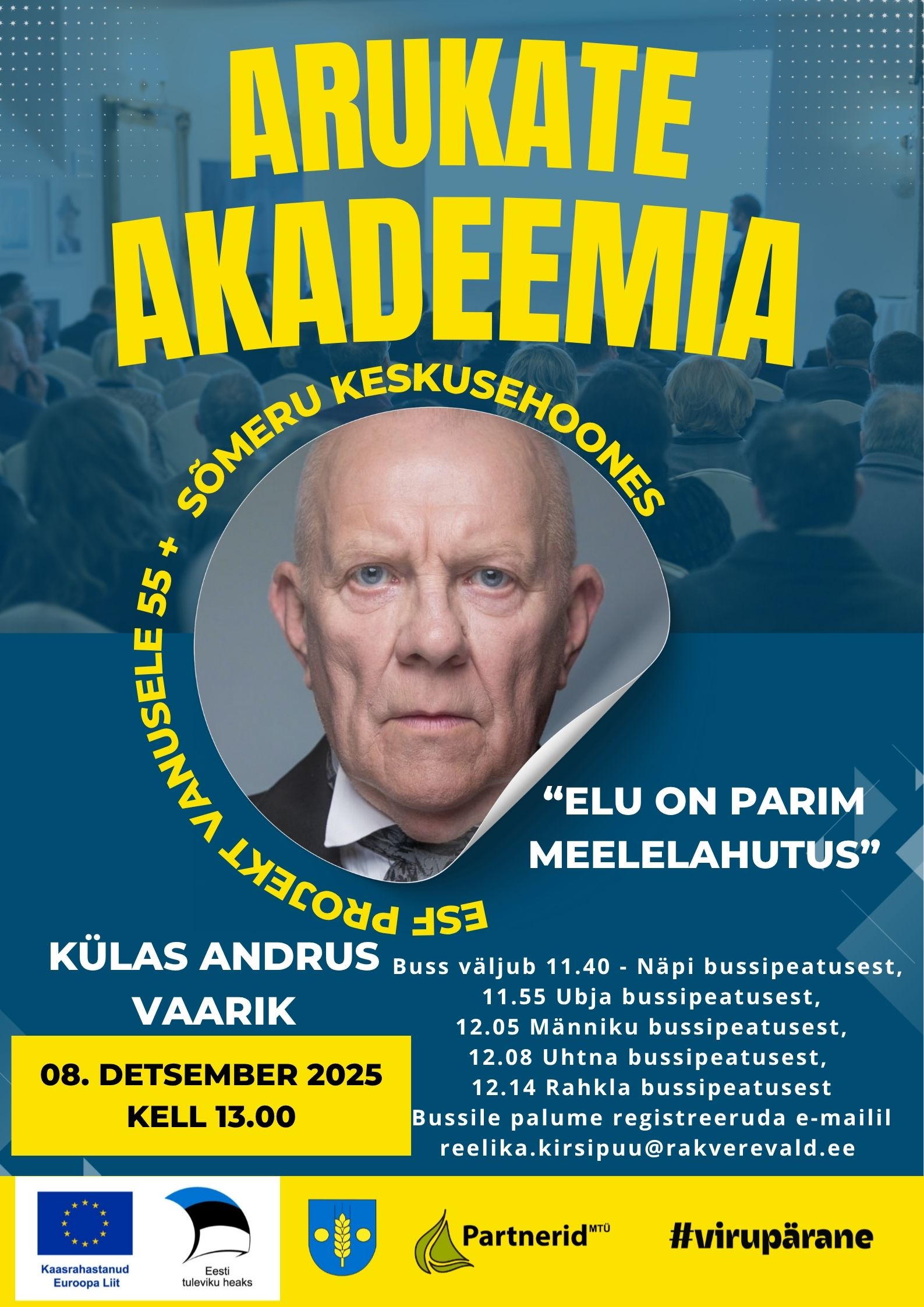 MTÜ Partnerid ESF+ meede 5.1 „Sotsiaalne toimetulek“ 2024.a esitatud miniprojekti “Arukate Akadeemia” raames korraldab Rakvere Vallavalitsus 8. detsembril 2025.a kohtumise Andrus Vaarikuga – „ Elu on parim meelelahutus“