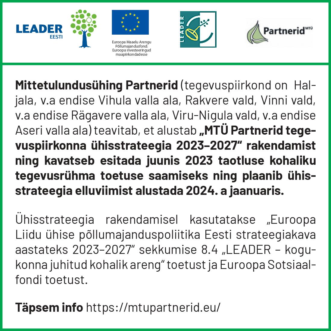 MTÜ Partnerid üldkoosolek võttis vastu 17.05.2023.a LEADERi kohaliku arengu strateegia 2023–2027, mis vastab maaeluministri 02.02.2022 määruse nr 7 „LEADERi kohaliku arengu strateegia 2023–2027 ettevalmistamise toetus“ (määrus) § 3 lõikes 3 nimetatud nõuetele (strateegia).