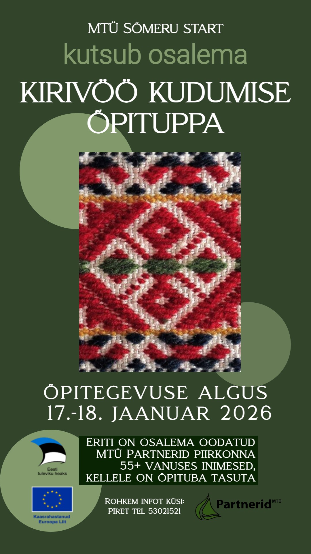 MTÜ Partnerid ESF+ meede 5.1 „Sotsiaalne toimetulek“ 2025.a. esitatud miniprojekti raames korraldab MTÜ Sõmeru Start 17.-18.jaanuar 2026.a koolituse “Kirivööde kudumise õpitoad”.