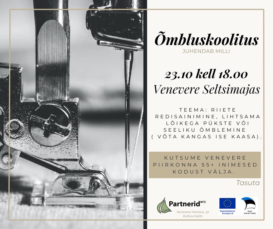 MTÜ Partnerid ESF+ meede 5.1 „Sotsiaalne toimetulek“ 2024.a esitatud miniprojekti “Kutsume Venevere 55+ inimesed kodust välja” raames viib Venevere Haridus- ja Kultuuriselts läbi 23. oktoobril 2025.a. Venevere Seltsimajas (Venevere, Vinni vald) õmblemise ja rõivaste redisainimise töötoa.