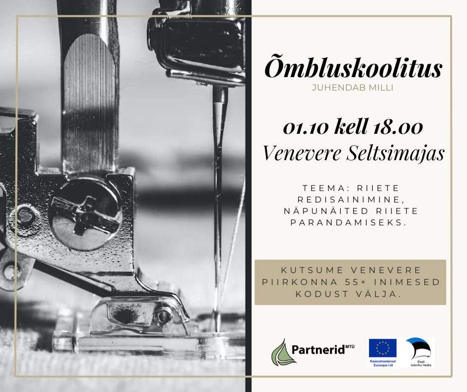 MTÜ Partnerid ESF+ meede 5.1 „Sotsiaalne toimetulek“ 2024.a esitatud miniprojekti “Kutsume Venevere 55+ inimesed kodust välja” raames viib Venevere Haridus- ja Kultuuriselts läbi 1. oktoobril 2025.a. Venevere Seltsimajas (Venevere, Vinni vald) õmblemise ja rõivaste redisainimise töötoa.