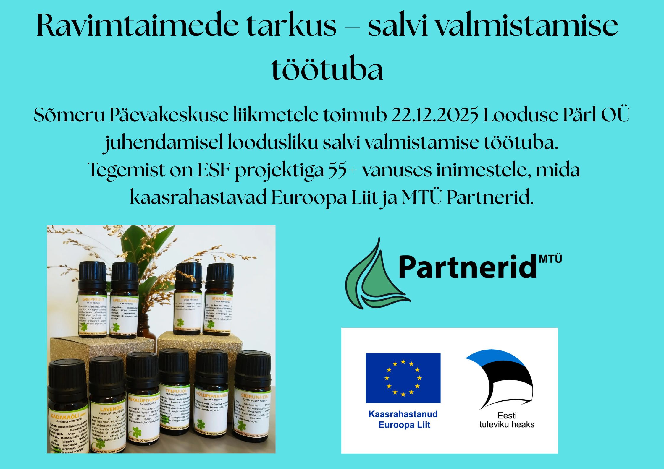 MTÜ Partnerid ESF+ meede 5.1 „Sotsiaalne toimetulek“ 2025.a esitatud miniprojekti raames korraldab Rakvere Vallavalitsus 22. detsembril 2025.a ravimtaimede tarkus – salvi valmistamise töötuoa.